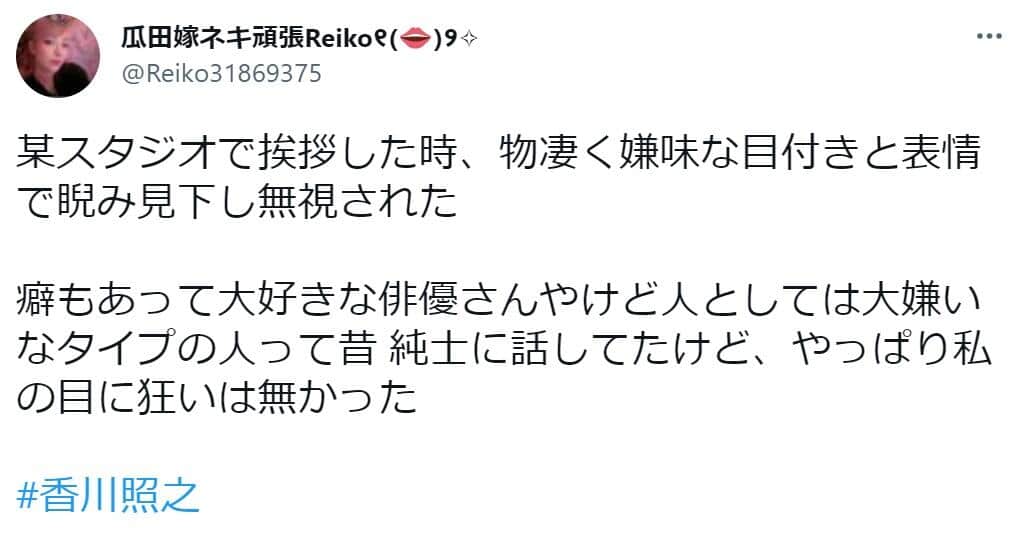 麗子さんはその記事について意見を述べた一般ユーザーのツイートを引用する形で「某スタジオで挨拶した時、物凄く嫌味な目付きと表情で睨み見下し無視された」と告白。「癖もあって大好きな俳優さんやけど人としては大嫌いなタイプの人って昔 純士に話してたけど、やっぱり私の目に狂いは無かった」とコメントしている。